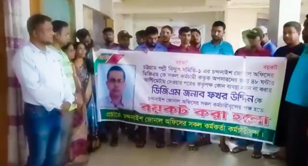 ৩১ জুলাই (বৃহস্পতিবার) সকালে চন্দনাইশ পল্লী বিদ্যুৎ কার্যালয়ের ডিজিএম মো. ফখর উদ্দিনকে বয়কট করে কর্মচারীরা কার্যালয় সম্মুখে কর্মসূচি পালন করেন।